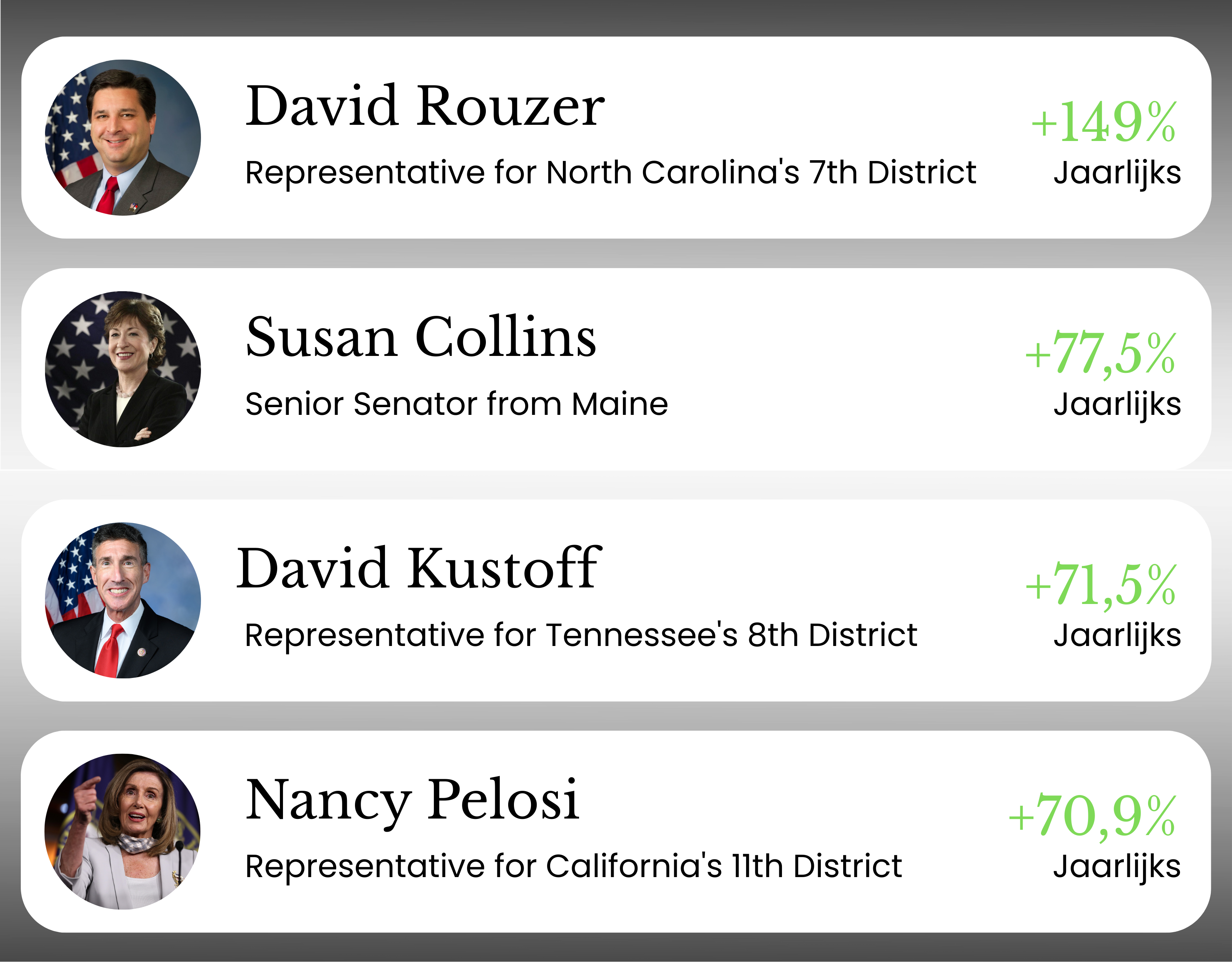 Absoluut! De informatie die wij verzamelen, wordt volgens de Amerikaanse wetgeving officieel vrijgegeven door de politici zelf. Wij verzamelen en analyseren deze data, om ze vervolgens direct naar jou door te sturen.